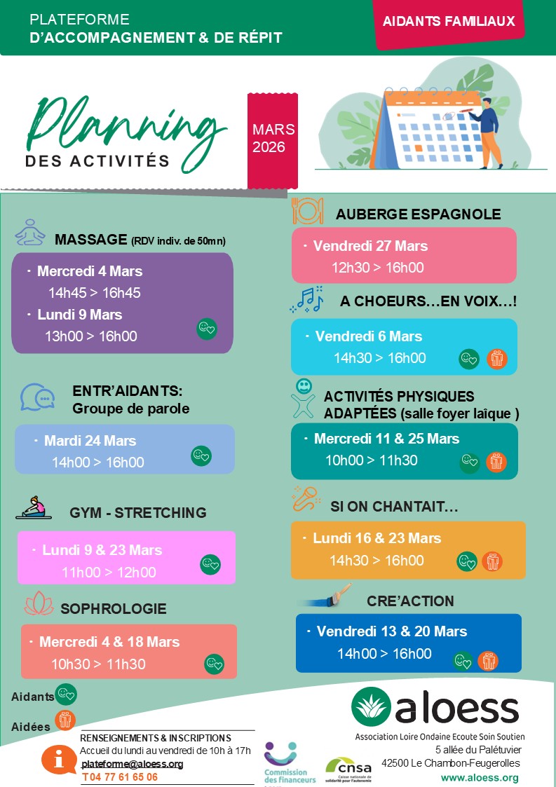 En Mars, la plateforme d’accompagnement et de répit de l’ALOESS poursuit ses actions auprès des aidants familiaux et des personnes aidées, en proposant un programme d’activités variées, adaptées aux besoins de chacun.